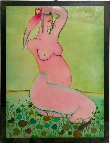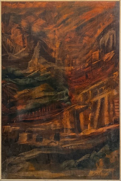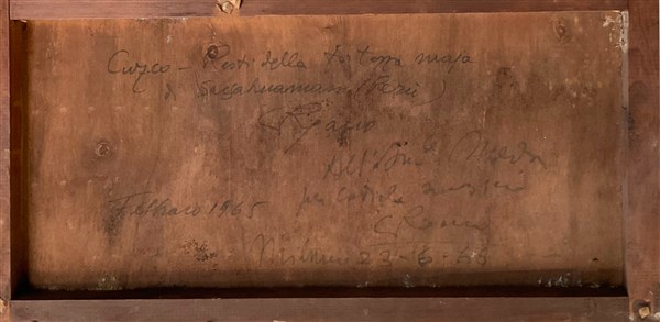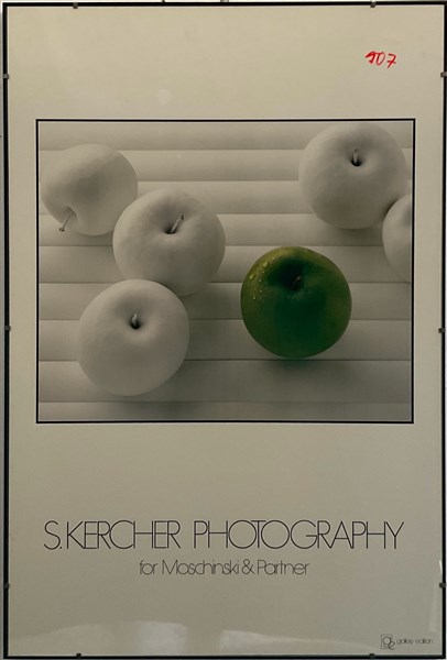 Lotto composto da due tecniche miste su masonite firmate Guatieri e datate rispettivamente 1974 e 1975 (cm 70x70 e cm 80x60) una tecnica mista su tavola "Resti della terra Maya" (cm 99x69) firmata Rigano e titolata e iscritta al verso, unite ad un manifesto raffigurante mele. Due in cornici