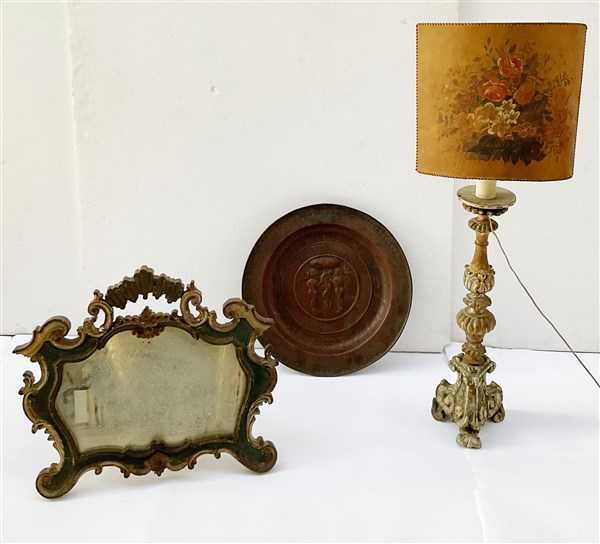 Lotto composto da un'antica cartagloria in legno intagliato e dipinto, un candeliere in legno intagliato ed un elemosiniere. Epoche differenti (h. max cm 86) (difetti)