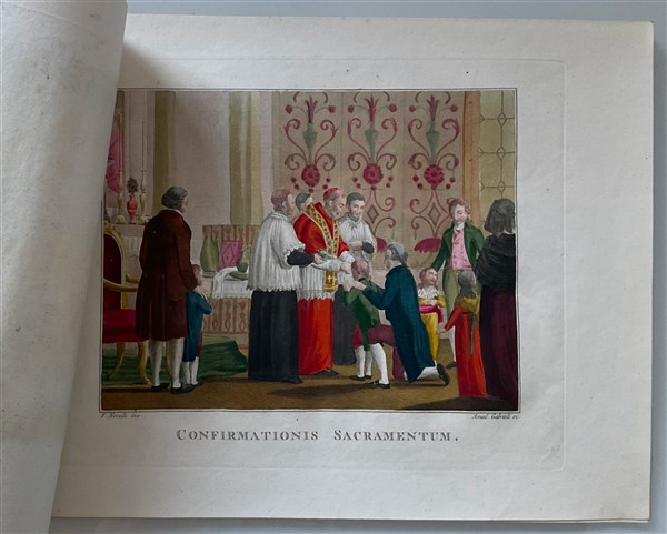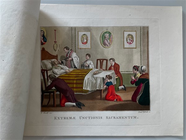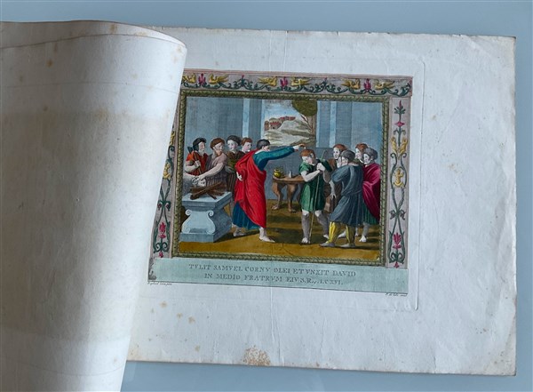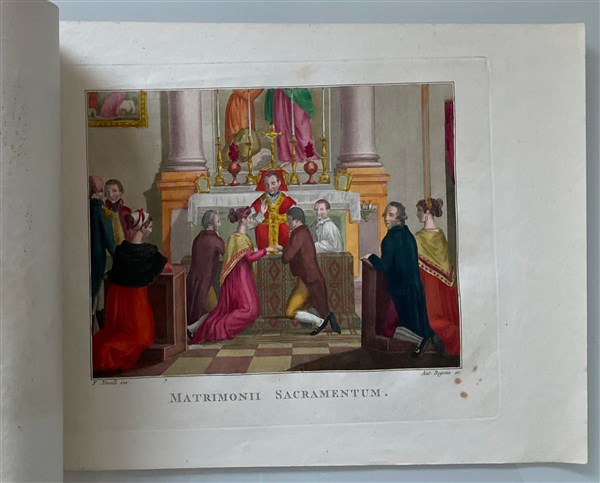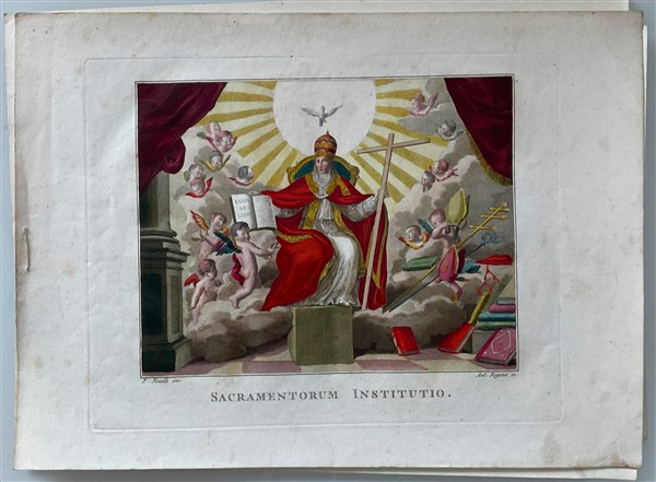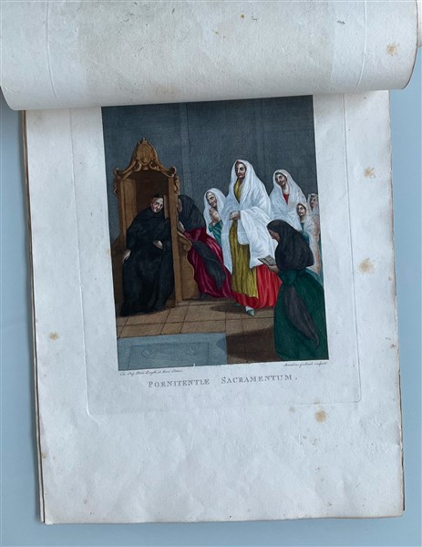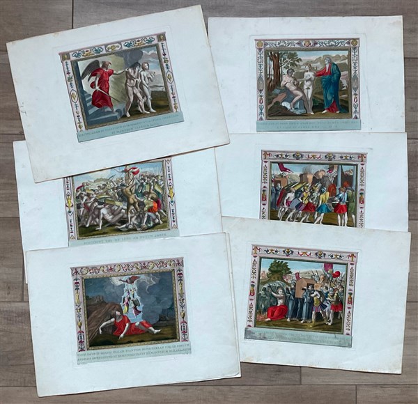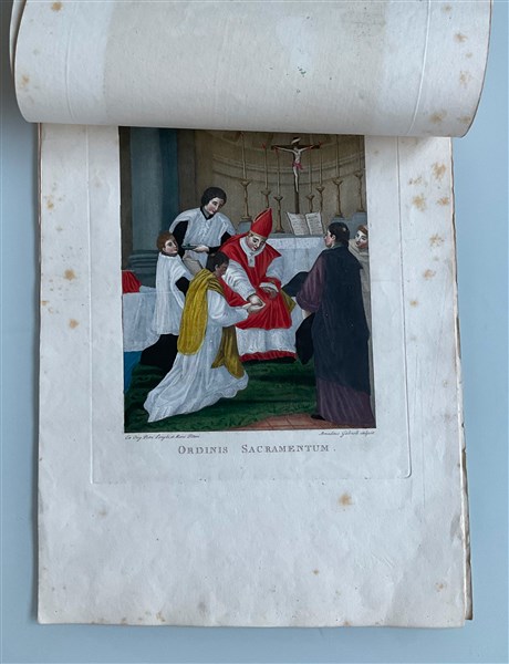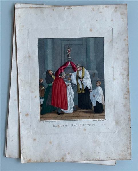 Cartella contenente quindici incisioni acquerellate a soggetto biblico(cm 35x48), e otto incisioni acquerellate raffiguranti sacramenti (cm 31x42). Secolo XIX (difetti)