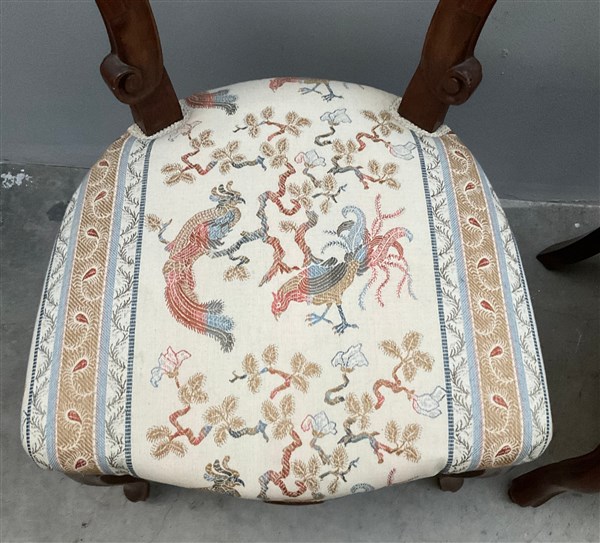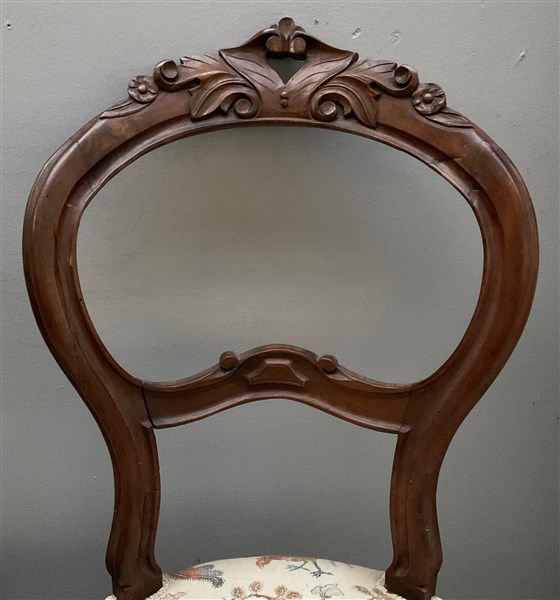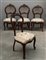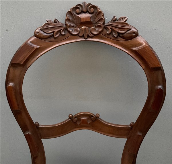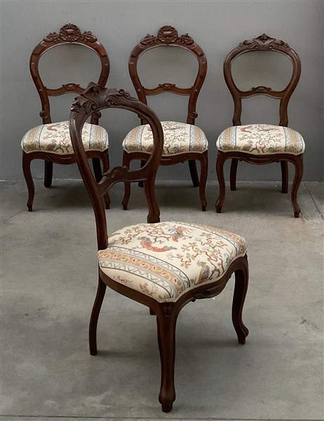 Due coppie di sedie Luigi Filippo in noce con schienali intagliati e gambe moss