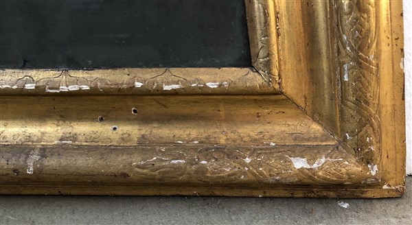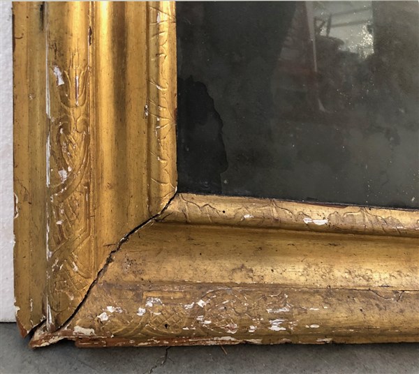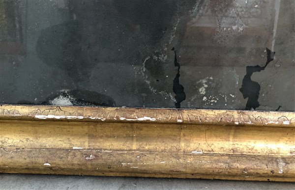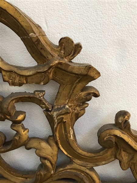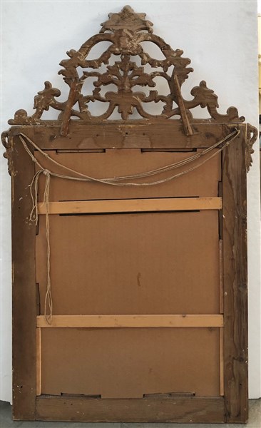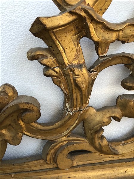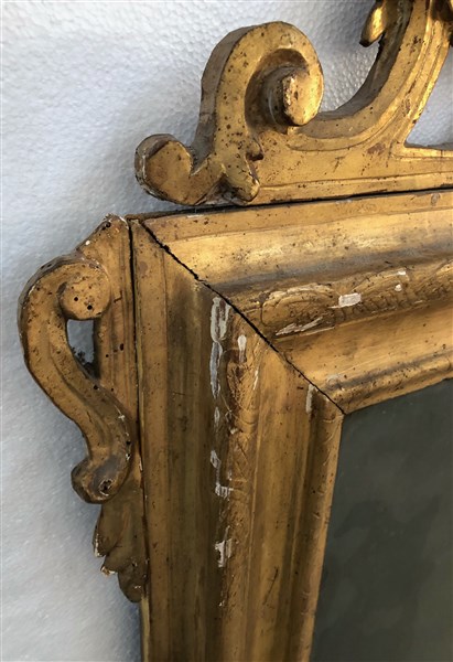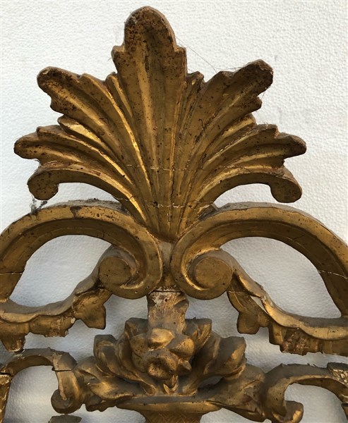 Specchiera in legno intagliato e dorato con cimasa traforata a volute e fiori. Secolo XVIII (cm 145x87) (difetti e restauri)