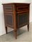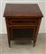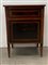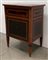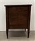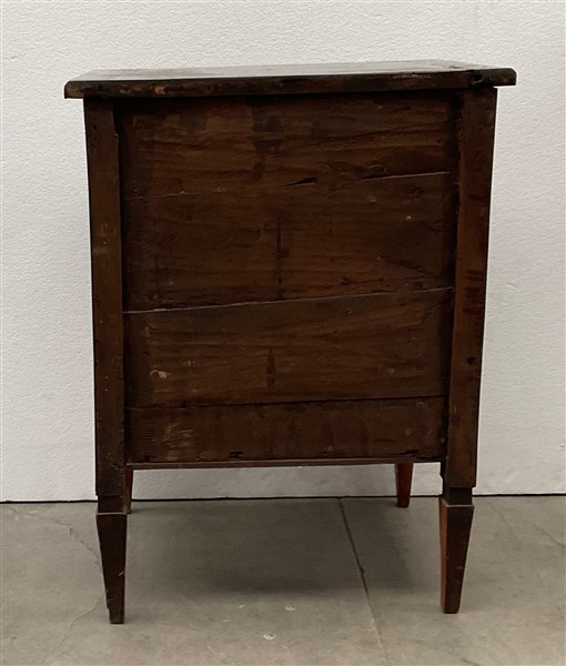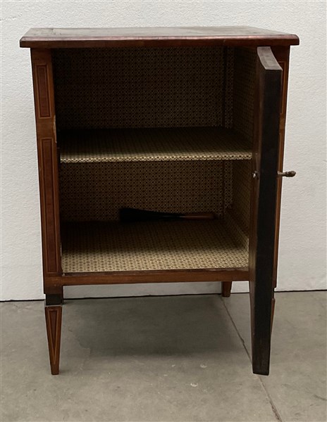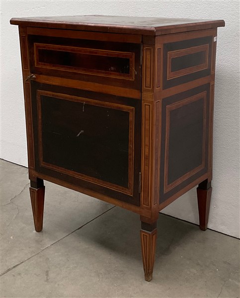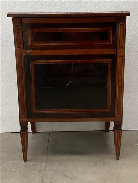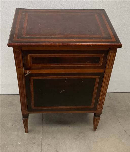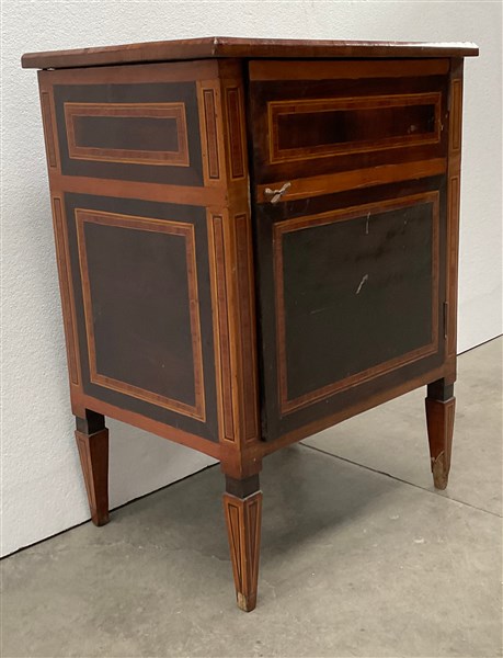 Comodino lastronato e filettatato in legni vari. Fronte ad un'anta e gambe ad obelisco rovesciato. Fine secolo XVIII (cm 55x74x40) (difetti)