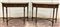 Coppia di tavoli da parete di forma sagomata lastronati in mogano, cassetto nel