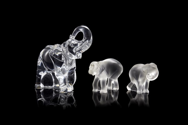 Lalique and Baccarat manufactures, 20th century. Three glass sculptures depicting elephants (different sizes) (minor defects)