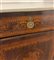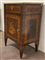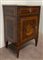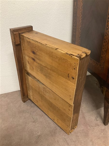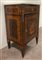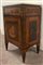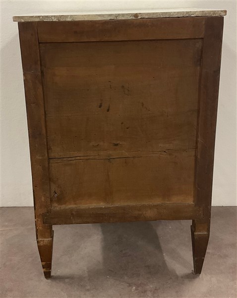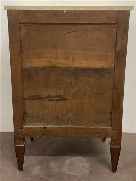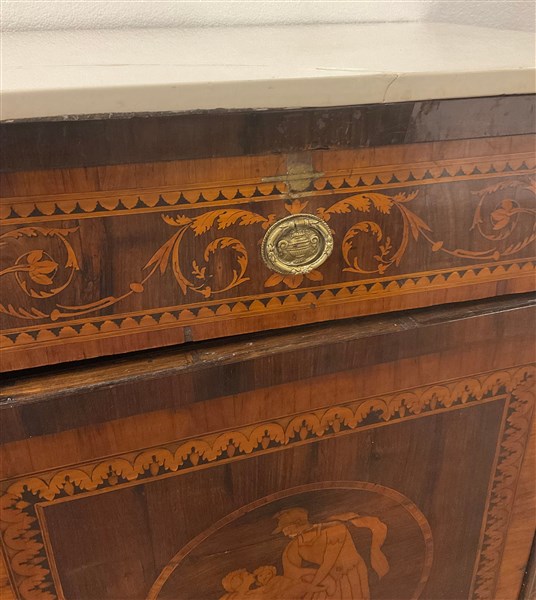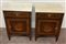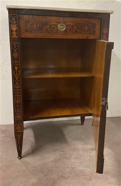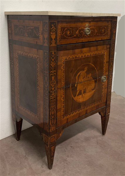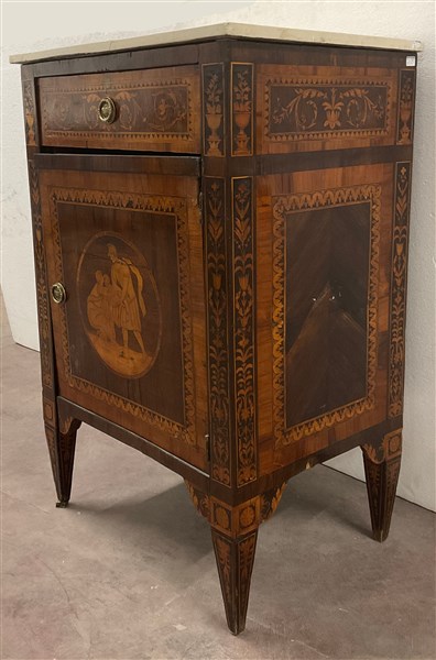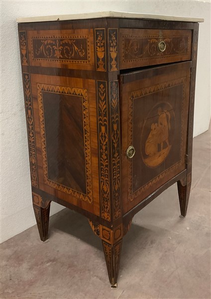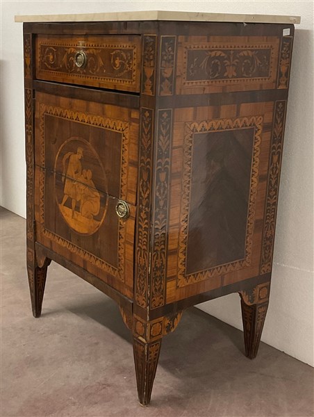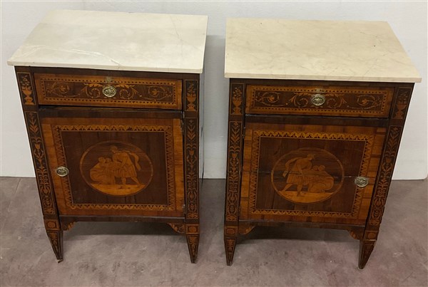 Coppia di comodini lastronati e intarsiati in legni vari a figure, candelabra e volute. Fronte a un'anta e un cassetto, gambe a obelisco rovesciato. Lombardia, fine del XVIII secolo. Piani in marmo bianco di epoca successiva (cm 57x86x41) (difetti e restauri)