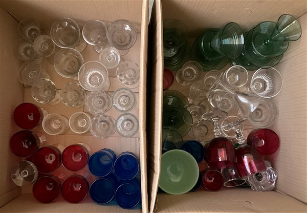 Lotto 748 | Due cartoni contenenti numerosi bicchieri e ciotole di diversa forma, colore e