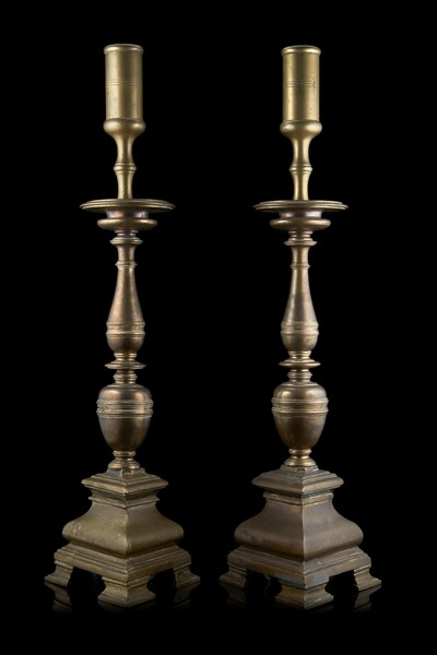 Coppia di grandi candelieri a rocchetto in bronzo con base di forma triangolare e piedini squadrati. Secolo XVII (h. cm 65) (lievi difetti)