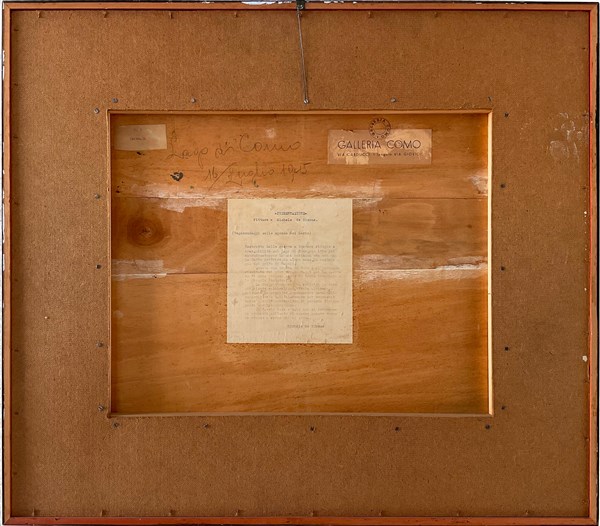 "Serenità" Lago di Como, 16 luglio 1915, olio su compensato (cm 35x45) Firmato in basso a destra. Al retro: iscrizioni cartigli e timbro. In cornice (difetti)