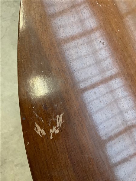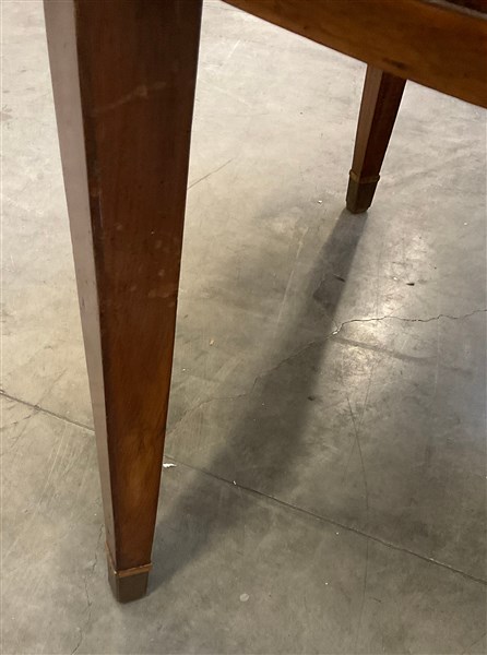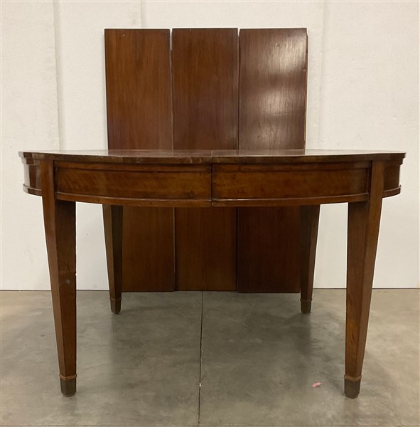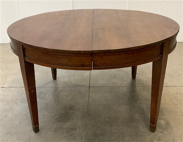 Tavolo con piano circolare allungabile e gambe rastremate, corredato da tre prolunghe. Secolo XIX (cm diam. 135,5 x h 75,5)(difetti)