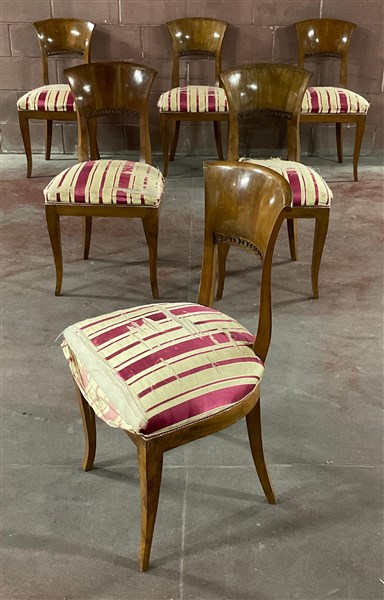 Gruppo di sei sedie in legno con schienali a giorno e sedute rivestite in tessuto a righe, secolo XIX (difetti)