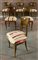 Gruppo di sei sedie in legno con schienali a giorno e sedute rivestite in tessu