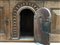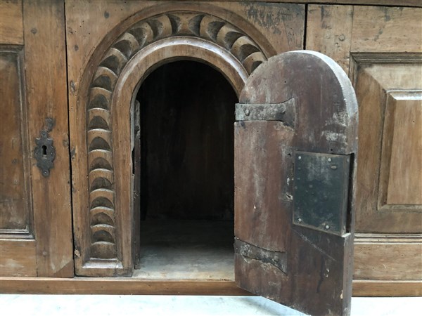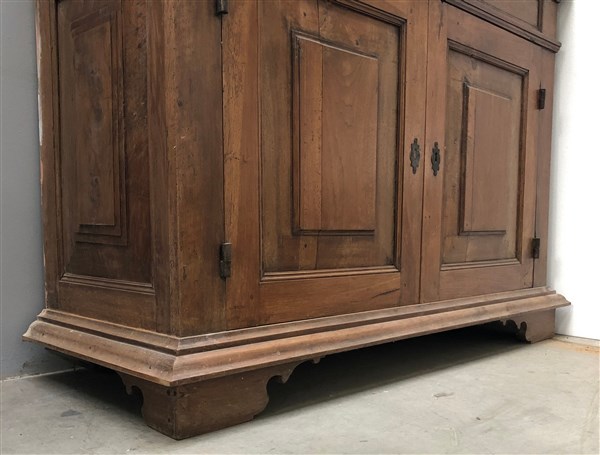 Antico mobile a due corpi in legni vari. Parte inferiore a due ante e due cassetti e parte superiore a cinque ante di cui una centinata. Cappello intagliato. Tracce di iscrizione (L. max cm 143, h. cm 247)(difetti e sostituzioni)