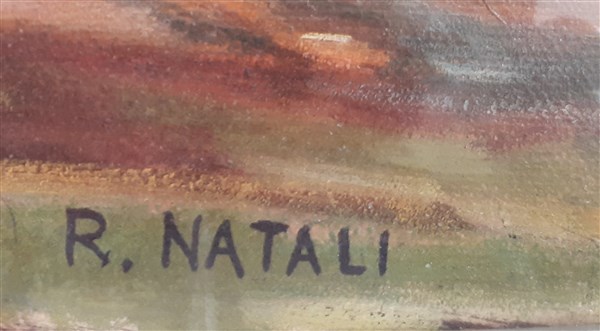 Ignoto del XX Secolo, "Conciliabolo femminile" olio su tela (cm 30x40) Firmato in basso a destra "R. Natali". Al retro: firmato. In cornice