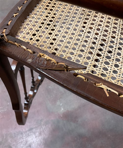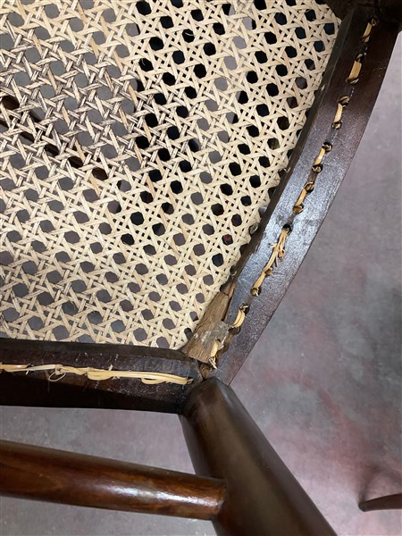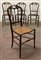 Quattro sedie chiavarine in legno tinto con gambe e traverse tornite. Sedute incannucciate (difetti)