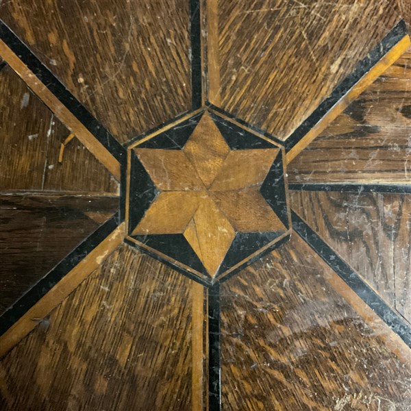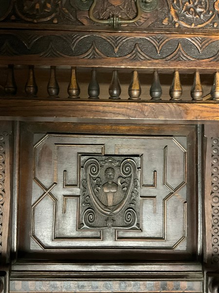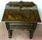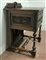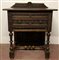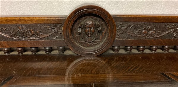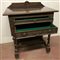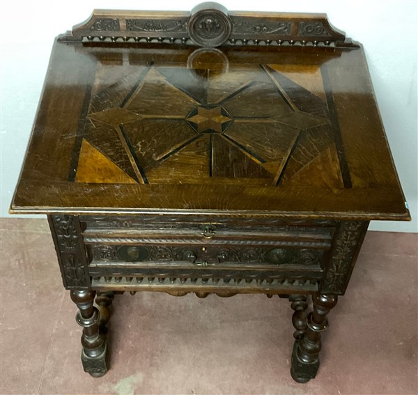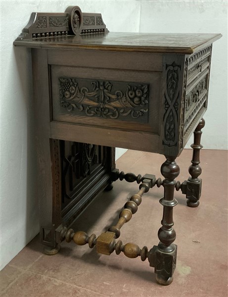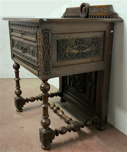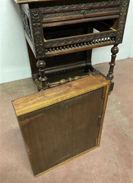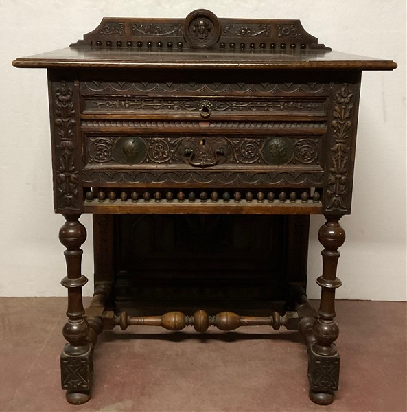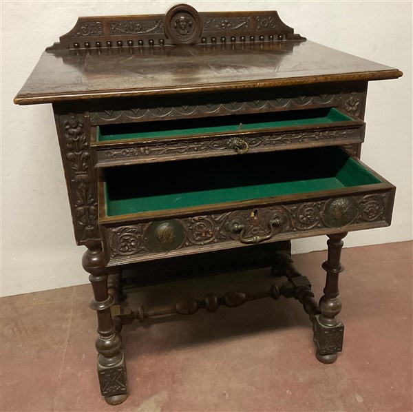 Mobile da parete in legni vari con fronte a due cassetti e gambe con traverse tornite, decori ad intaglio e piano intarsiato a motivi geometrici. Secolo XIX (cm 79x 94x57,5) (difetti)