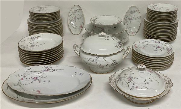 Manifattura di Ginori. Parte di servizio da tavola in porcellana a bordo mistilineo profilato in oro decorata in policromia a fiori composto da: trenta piatti piani, quattordici piatti fondi, sedici piatti da frutta, legumiera con coperchio, zuppiera biansata con coperchio, insalatiera, alzata, cinque piatti da portata (difetti e restauri)