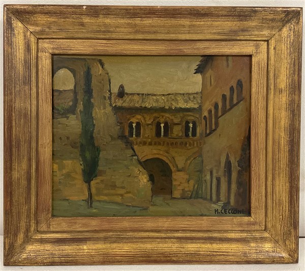 Lotto 935 | M. Cecconi, "Cortile con cirpresso" olio su cartone (cm 31,5x38) Firmato in bas