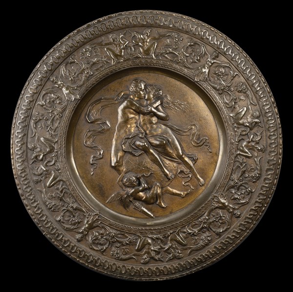 Grande piatto in metallo decorato nella falda a personaggi con cornucopie, volute e figure stilizzate. Nel cavetto Cupido che sorregge il globo terrestre sormontato da figure allegoriche. Monogrammato e datato in basso a sinistra (h. cm 80; d. cm 75)