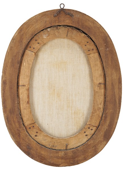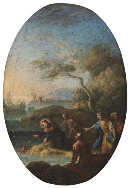 Scuola del XVIII secolo, Scena miracolosa, olio su tela ovale (cm 29x41) in cornice del XVIII secolo (difetti)