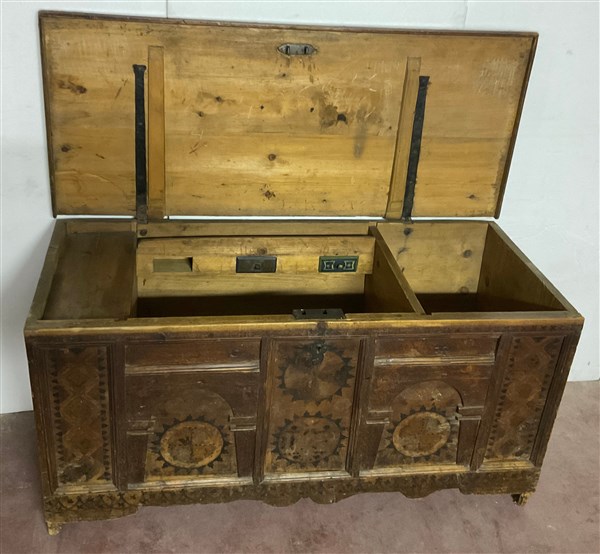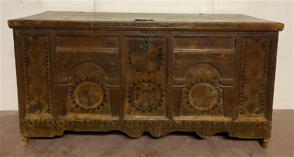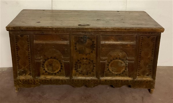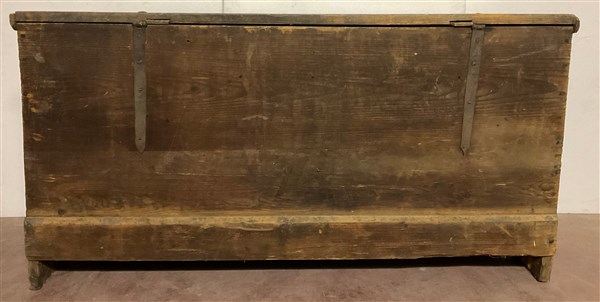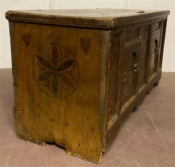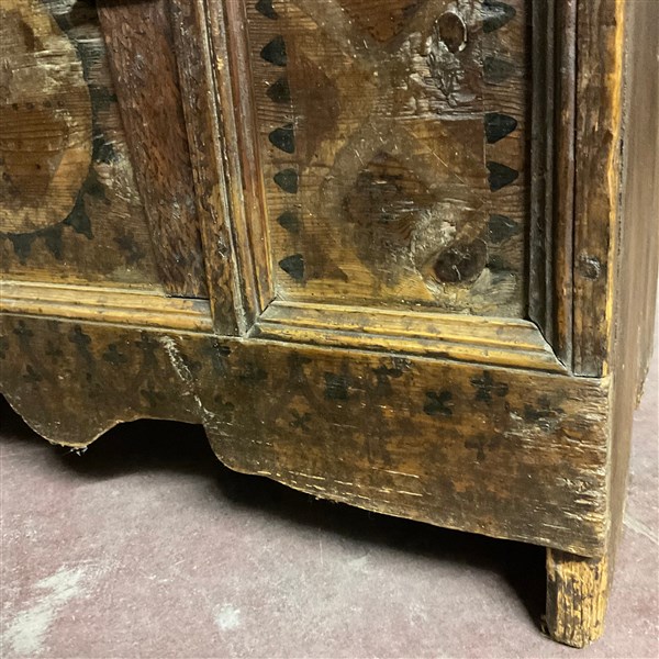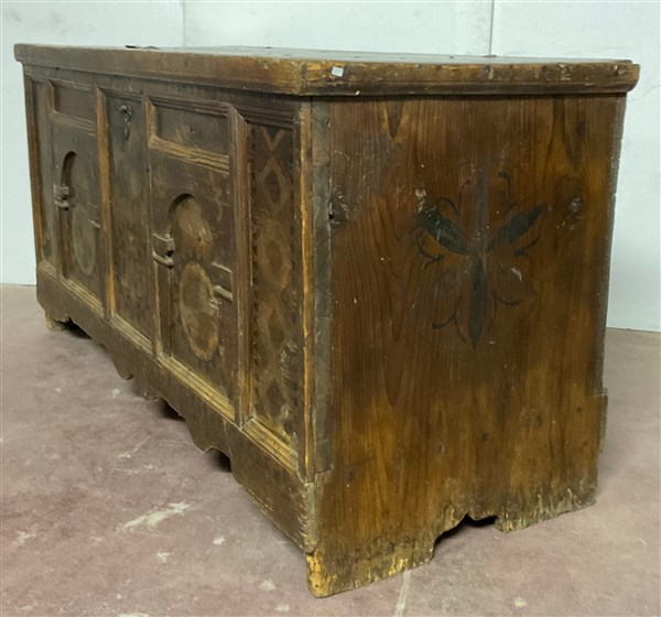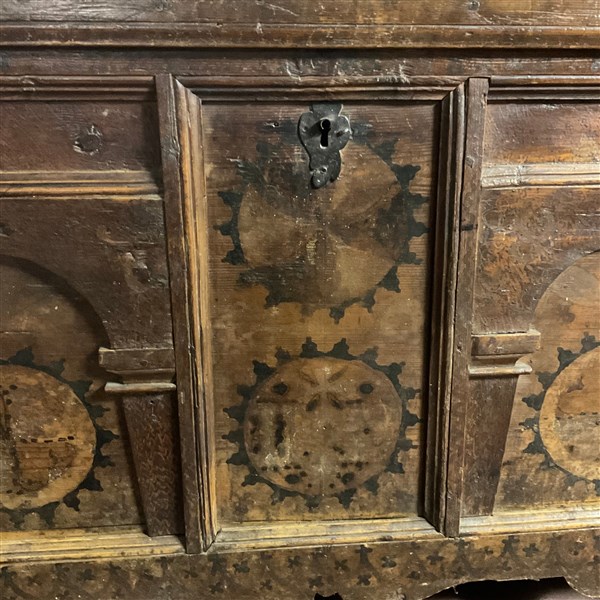 Cassone in legni vari, fronte decorato da pennellature, tracce di policromia. Secolo XVIII (cm 163x 83x68) (difetti e restauri)