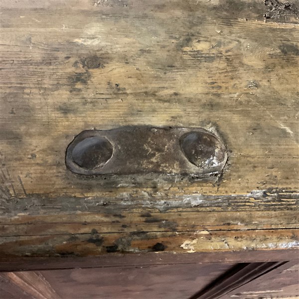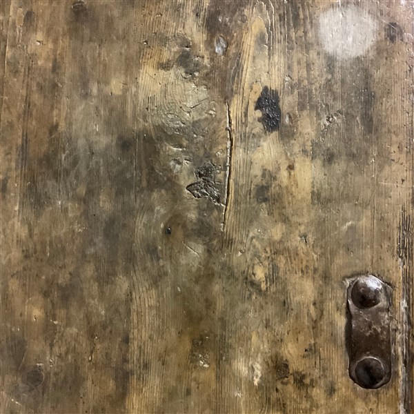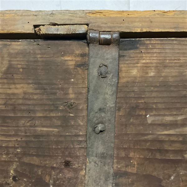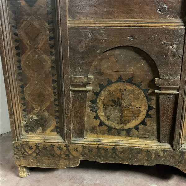 Cassone in legni vari, fronte decorato da pennellature, tracce di policromia. S