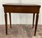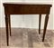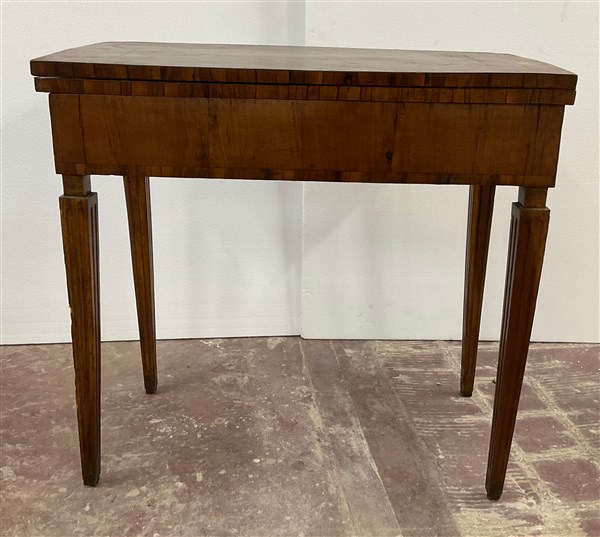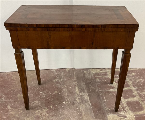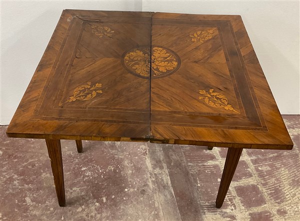Tavolo da gioco in legni vari lastronato e filettato, piano apribile a libro intarsiato con rosone centrale e motivi fitomorfi agli angoli entro riserva. Gambe scanalate ad obelisco rovesciato. Fine secolo XVIII (cm 81x77x41) (difetti, mancanze e sostituzioni)