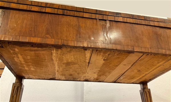 Tavolo da gioco in legni vari lastronato e filettato, piano apribile a libro in