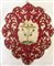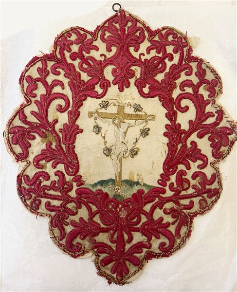 Manifattura italiana, secolo XVII. Ricamo in seta a punto lanciato raffigurante Cristo crocifisso, il bordo del ricamo è decorato da volute e rami fioriti realizzati in seta rosso cardinale imbottita ed applicata (difetti)