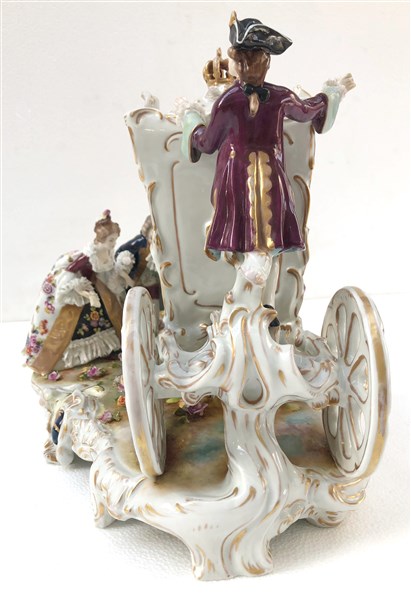 Manifattura di Capodimonte, gruppo in porcellana dipinta in policromia raffigurante carrozza trainata da cavalli (cm 58x34) (difetti)