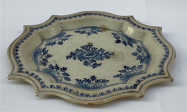 Manifattura di Lodi, secolo XVIII. Piatto in maiolica a profilo mistilineo con decoro in blu a fiori. (L. cm 31x26) (restauri)
