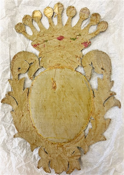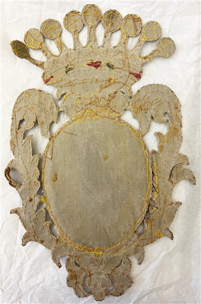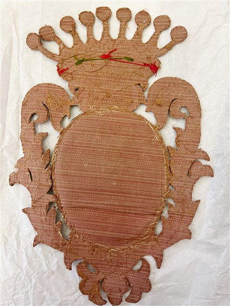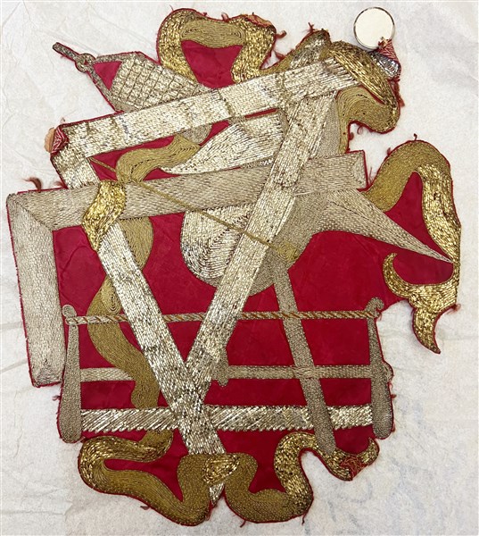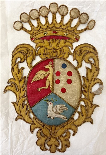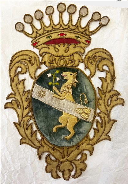 Gruppo di sei stemmi araldici con stemmi nobiliari e simboli massonici realizzati in tessuti ricamati con applicazioni in seta, fili metallici e velluti. Raffiguranti varie armi e gradi di nobiltà. Manifatture ed epoche differenti (cm 20x30 circa) (difetti)