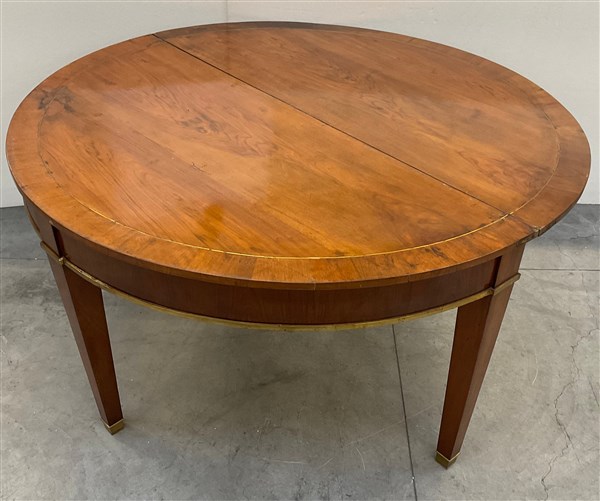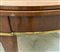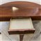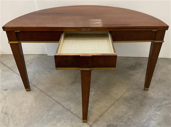 Tavolo da parete a mezzaluna in noce con piano a libro, bordure e piedi in metallo dorato (chiuso cm 147,5) (difetti)