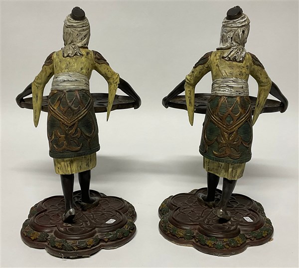 Coppia di figure in metallo in parte dipinto e dorato a forma di figure orientaliste reggenti vassoio (h cm 36). Inizio secolo XX. (difetti)