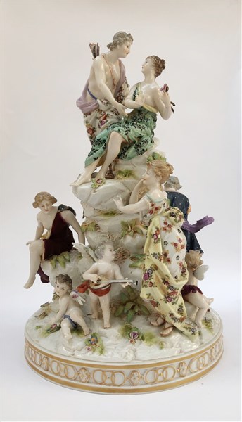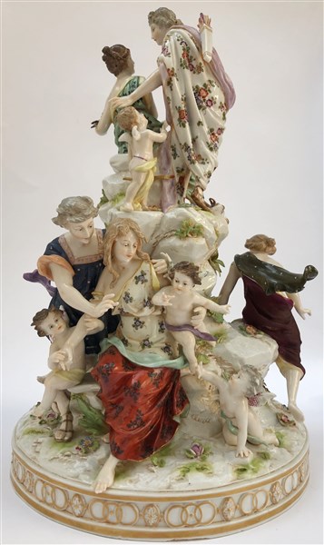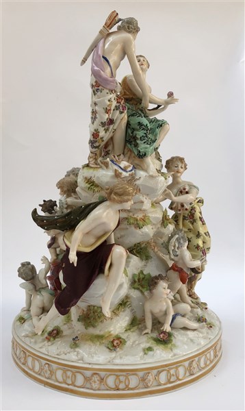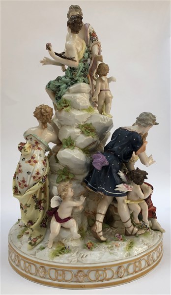 Manifattura tedesca, gruppo in porcellana dipinta in policromia raffigurante figure allegoriche (cm 23x41) (difetti e rotture)