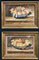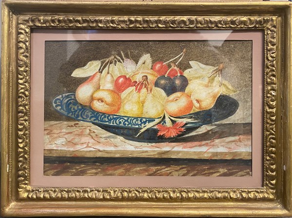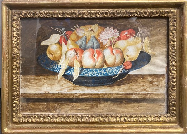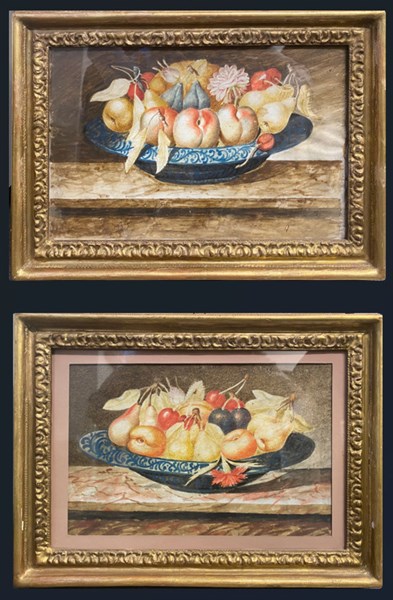 Cerchia di Octavianus Monfort, coppia di dipinti a tempera su pergamena raffiguranti composizioni di vasi con fiori e frutta (cm 24x5x36) in cornici (difetti)