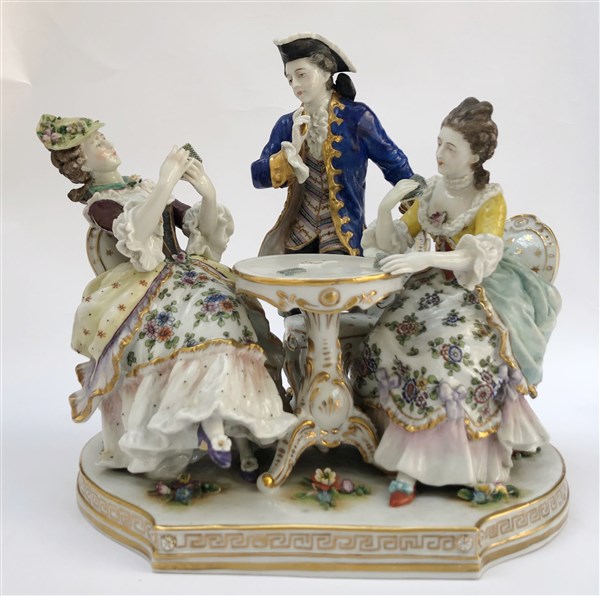 Manifattura di Capodimonte, gruppo in porcellana dipinta in policromia raffigurante giocatori di carte intorno ad un tavolo (cm 28x25) (difetti)