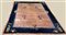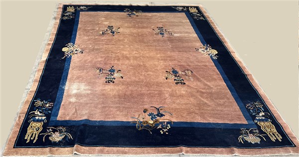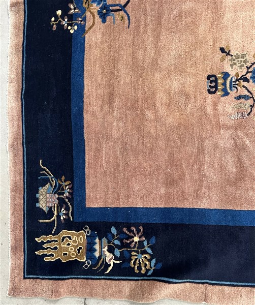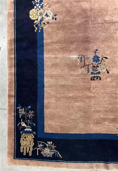 Tappeto Pekino, Cina, secolo XX. Campo tinta unita rosa con quattro vasi fioriti. Bordura a fondo blu scuro con rami e vasi fioriti che invadano il campo (cm 296x241) (difetti e rapature)