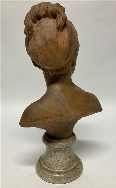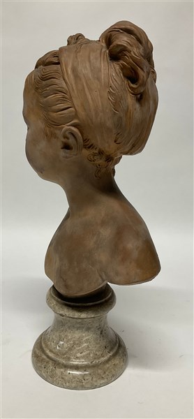 Da J.A.Houdon. Busto di Louise Brongniart fanciulla, terracotta su base in marmo firma "Houdon Paris" al retro (h totale cm 47) (lievi difetti)