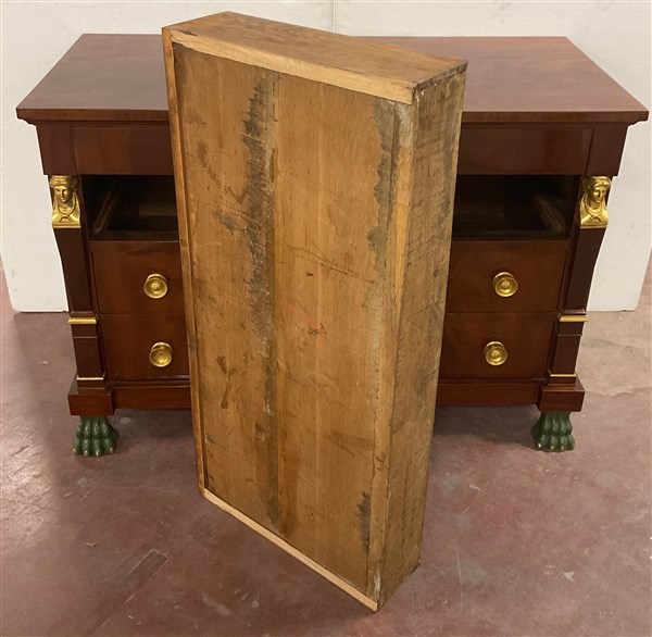 Cassettone Impero in piuma di mogano a quattro cassetti di cui uno a mezza lung