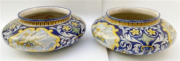 Coppia di cache-pot in ceramica policroma con decoro a putti e volute fiorite su fondo blu. Secolo XX (d. cm 45) (difetti)