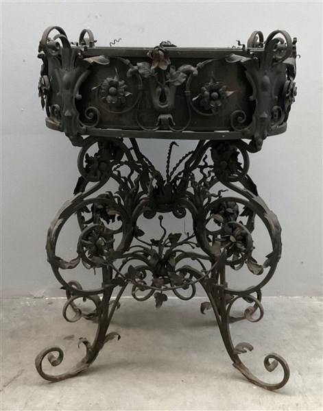 Fioriera in ferro forgiato ovale con sostegno a volute fiorite raccordate da festoni. Inizio secolo XX (h. cm 99) (difetti)