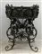 Fioriera in ferro forgiato ovale con sostegno a volute fiorite raccordate da fe