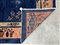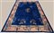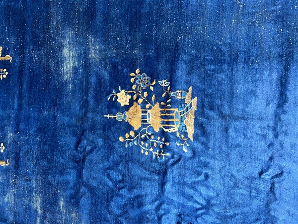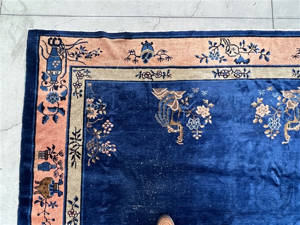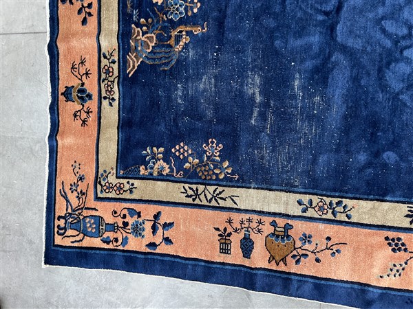 Tappeto Pekino, Cina, secolo XX. Decoro con pagoda ed alberi fioriti su campo blu Cina. Bordura a fondo rosa (cm 287x241) (difetti e rapature)