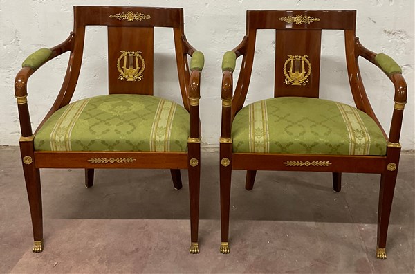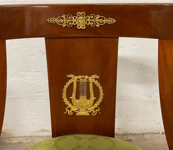 Coppia di poltrone in mogano a gondola con gambe a sciabola, fregi in bronzo do