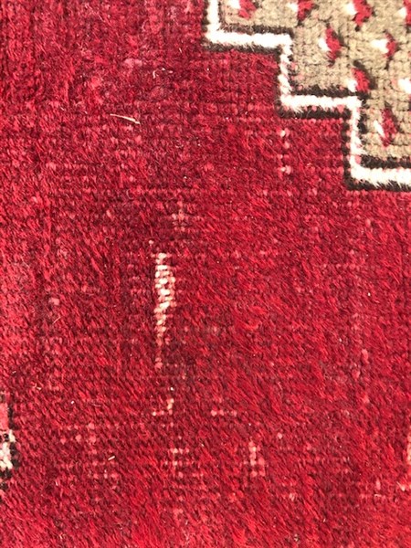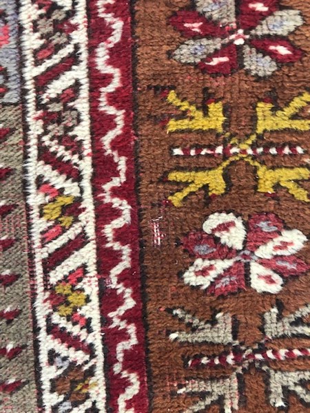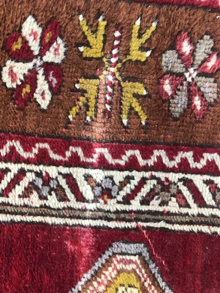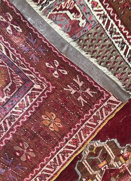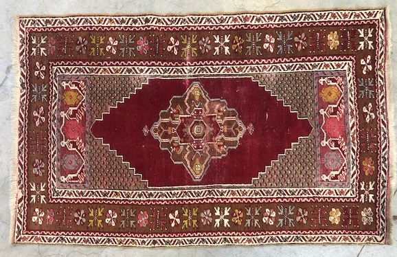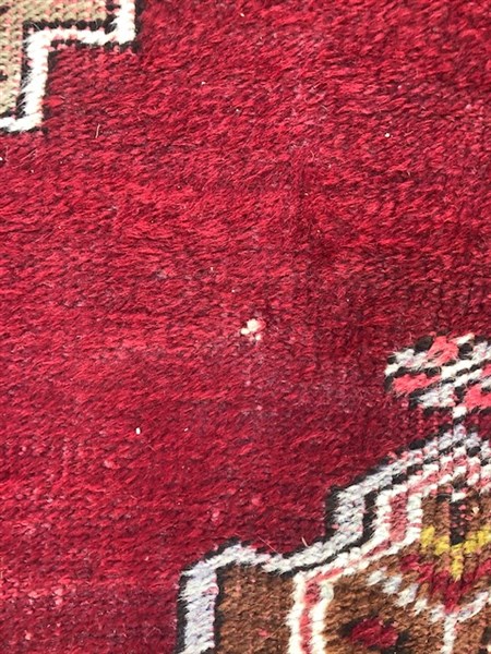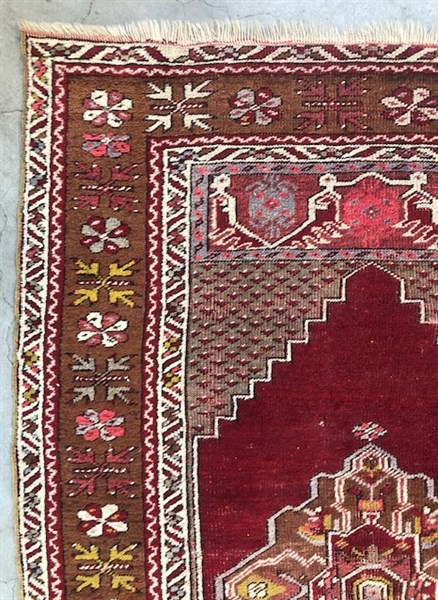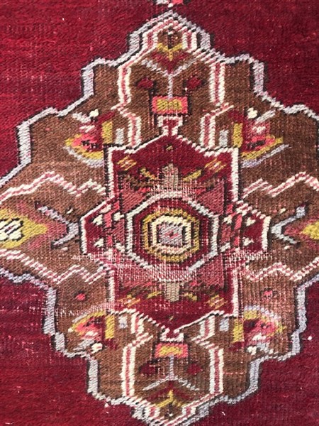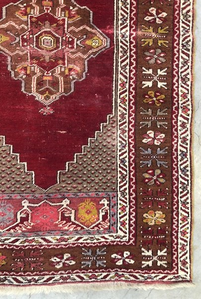 Tappeto Mudjur, Anatolia, inizio secolo XX. Decoro con medaglione su campo rosso (cm 158x100) (difetti)