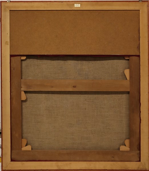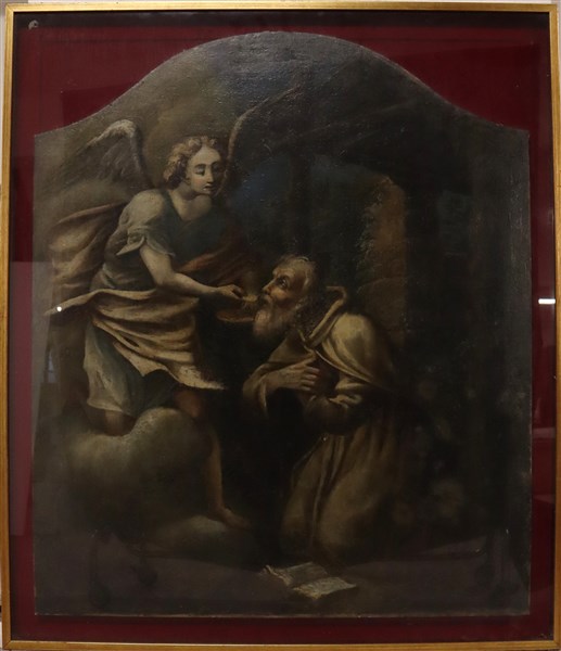 Ignoto, antico dipinto a olio su tela sagomata raffigurante la comunione di un santo (cm 105x90) entro una teca