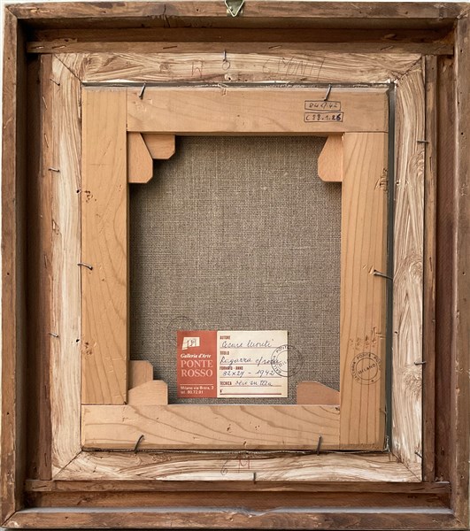 "Ragazza con rosa" olio su tela (cm 32x27) Firmato in basso a sinistra. Al retro: timbri e cartiglio