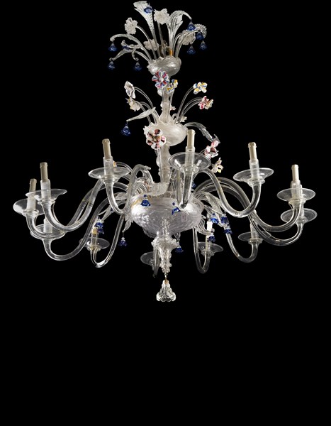 Manifattura di Murano, inizio secolo XX. Lampadario in vetro incolore a dodici luci decorato in policromia a fiori, foglie e pendenti (h. cm 130; d. cm 120) (difetti e mancanze)