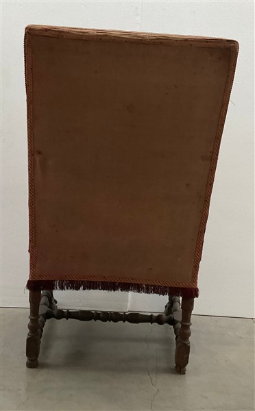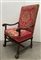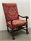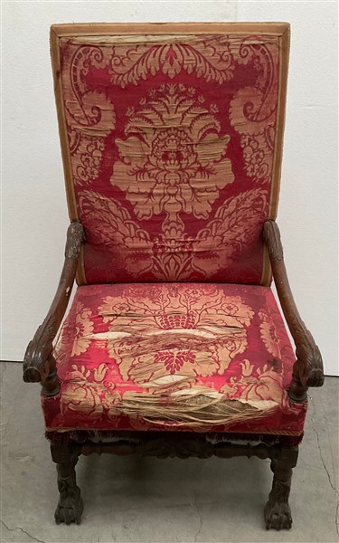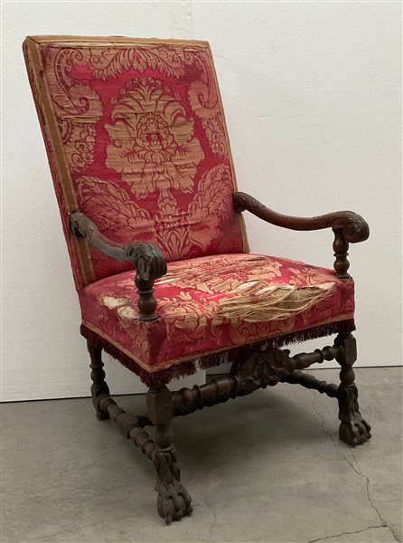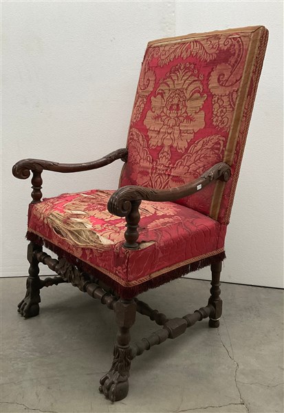 Poltrona in legni vari con braccioli intagliati a volute, gambe e traverse tornite a rocchetto, piedi ad artiglio su sfera. Secolo XVII (cm 58x110x70)(difetti e restauri)