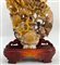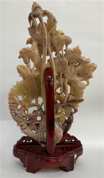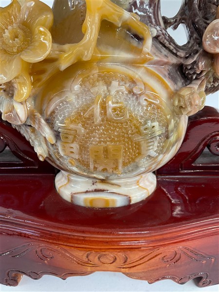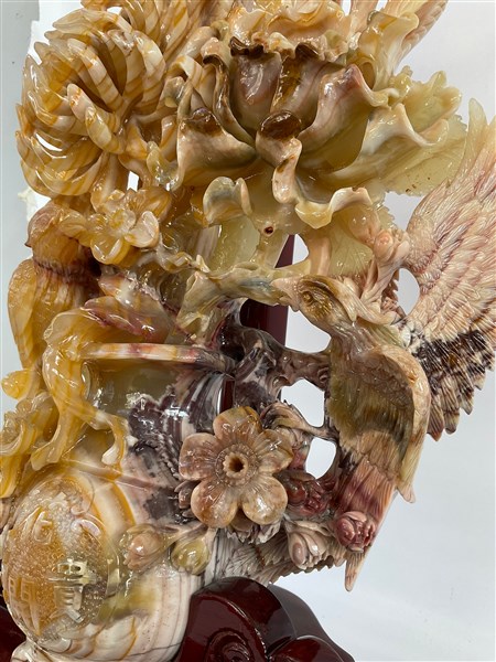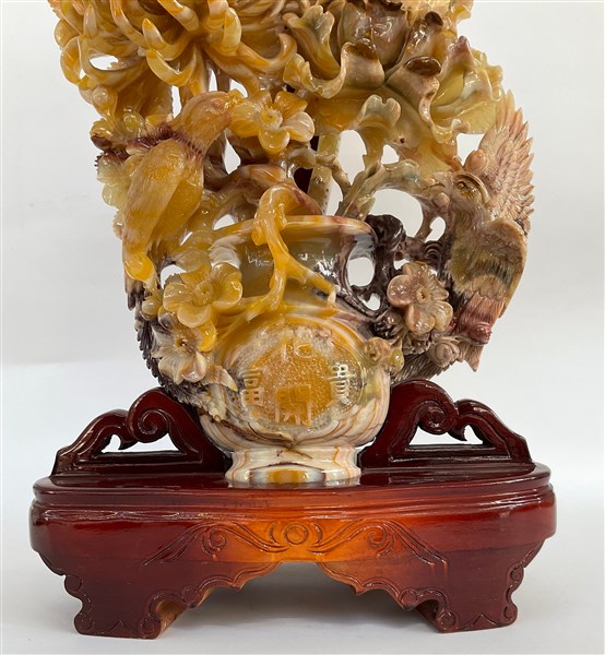 Grande gruppo in quarzo microcristallino raffigurante vaso con mazzo di fiori, poggiante su base in legno Cina, sec. XX (cm 35x57) (difetti)